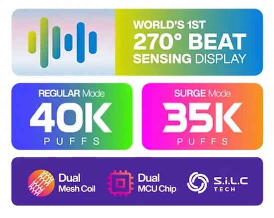 - Regular & Surge Mode für zwei verschiedene Dampfcharaktere in einem Gerät.
